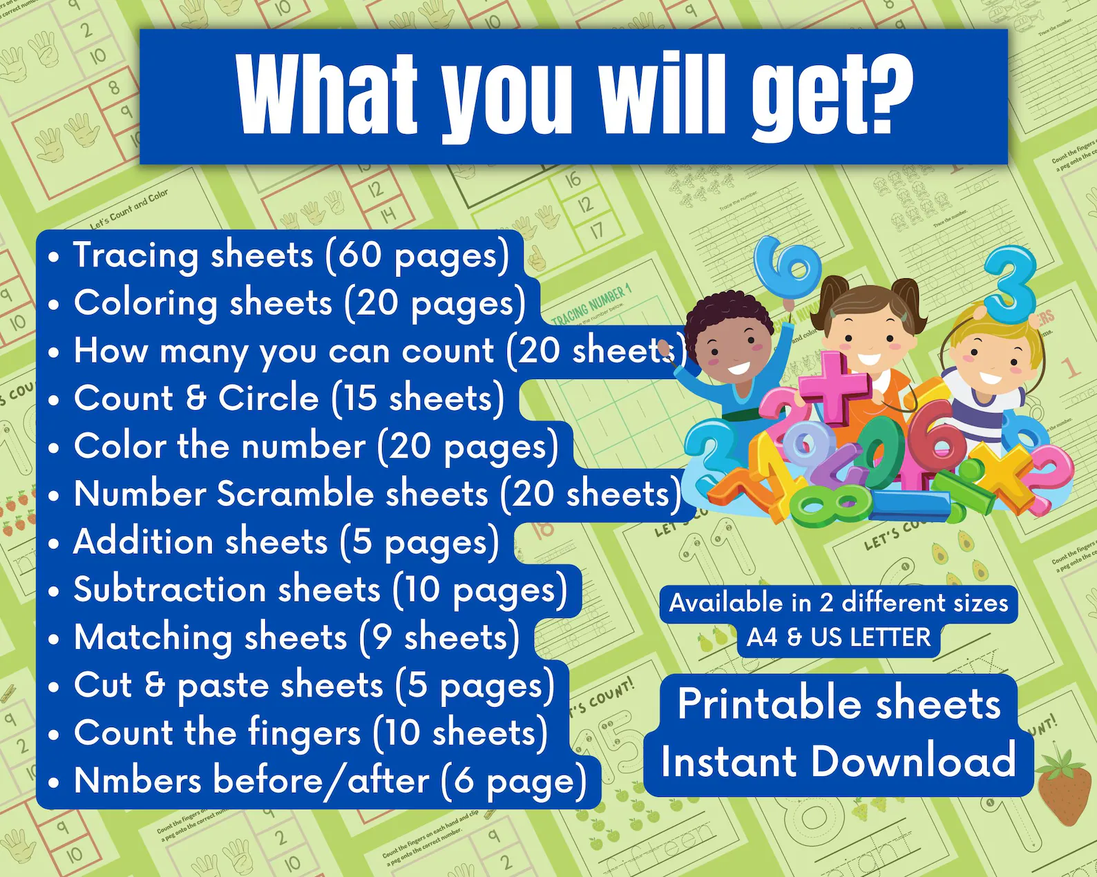 Preschool Math Worksheets, 200+ Printable Educational Posters & Flashcards, Kindergarten Numbers & Counting Activities, Instant Download